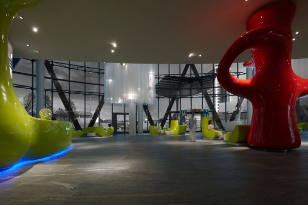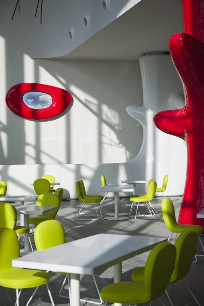 Fitomorfiche sculture, costituiscono l’intero apparato strutturale e funzionale del piano terra. Le colonne, i desk della reception, il bancone il desk della reception, il bancone bar, il piano del cook-show, nascono da una materia lucida, fluida, dinamica, una continua fuga da stereometriche geometrie canoniche.